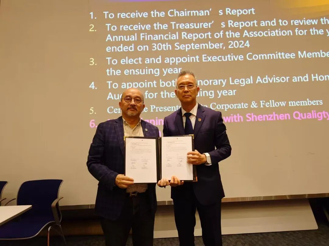 12月12日,香港品质管理协会在香港特别行政区九龙湾港铁总部举办会员周年大会,深圳市质量协会会长李榕受邀出席。作为大会的重要一环,香港品质管理协会与深圳市质量协会举行质量工程专业技术人才资格互认谅解备忘录签署仪式。此次签署,标志着双方质量人才培训证书互认名录再扩容,将进一步加强粤港澳质量工程技术人才的交流与合作,助力粤港澳大湾区高质量发展。